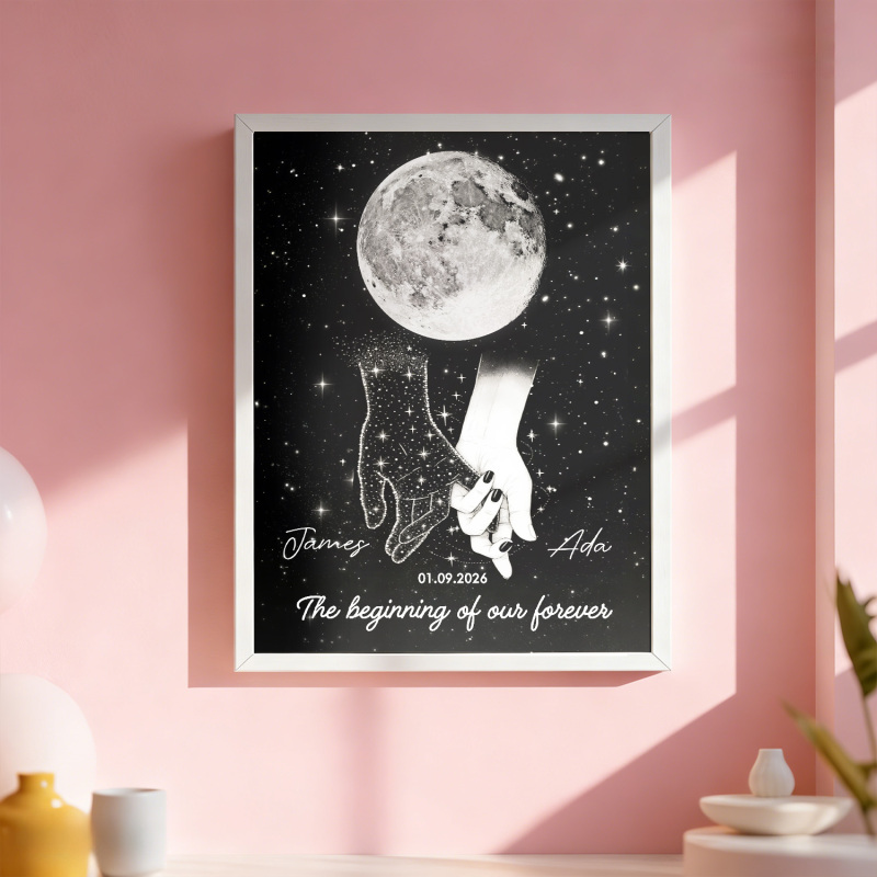 Couple Se Tenant La Main Sous La Nuit Galactique, Phase De Lune Personnalisée, Date D'anniversaire - Poster Personnalisé - Cadeau D'anniversaire Touchant, Cadeau De Saint-valentin, Cadeau De Mariage Pour Un Couple